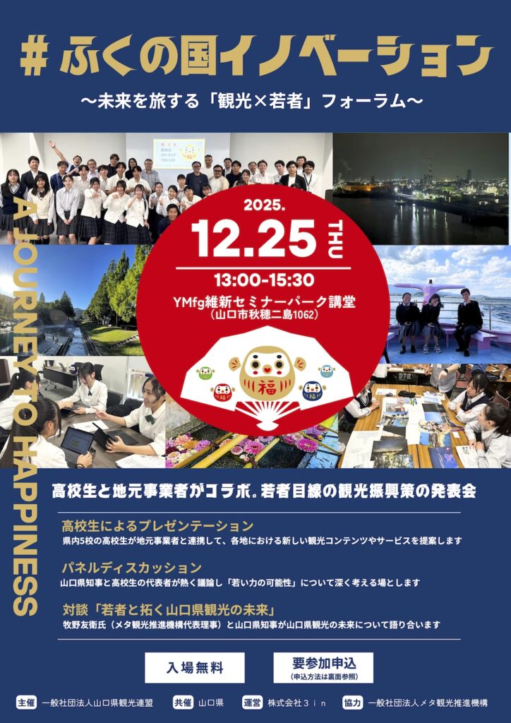 当機構が協力・連携しております山口県の観光イベント「#ふくの国イノベーション ~未来を旅する「観光×若者」フォーラム~」が、2025年12月25日(木)に開催されます。