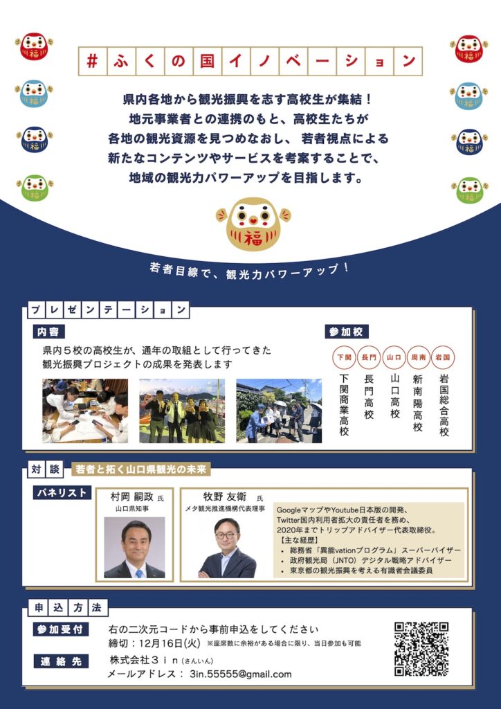- 高校生によるプレゼンテーション 県内5校(岩国総合高校、新南陽高校、山口高校、長門高校、下関商業高校)の高校生が、地元事業者と連携した新しい観光コンテンツやサービスを提案します。